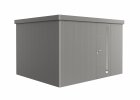 Plechový záhradný domček Biohort NEO 3D, jednokrídlové dvere, strieborný metalický