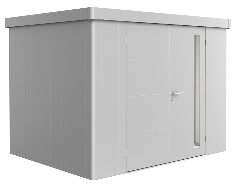 Plechový záhradný domček Biohort NEO 2C, dvojkrídlové dvere, strieborný metalický